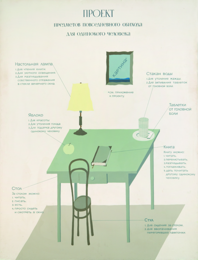 Советские художники высмеивали рамки, в которые архитекторы загнали советского человека. Художник Виктор Пивоваров в 1975 году даже создал «Проект предметов повседневного обихода для одинокого человека».